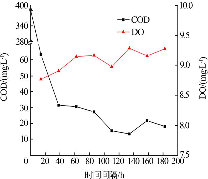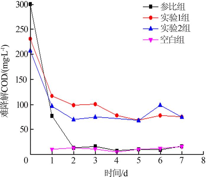 (6)测试。将待测废液通过滤膜过滤,取滤液1 000 mL至试剂瓶中,通过蠕动泵循环泵入玻璃柱,同时标记试剂瓶液位(试剂瓶中溶解氧7.0~10.0 mg/L)。以一定的时间间隔(每12 h或24 h)用移液枪取样3 mL,按快速密闭催化消解法(含光度法)〔4〕测定COD,持续测试直至COD达到最低,最低COD值即为溶解性难降解COD。同时进行参比实验。