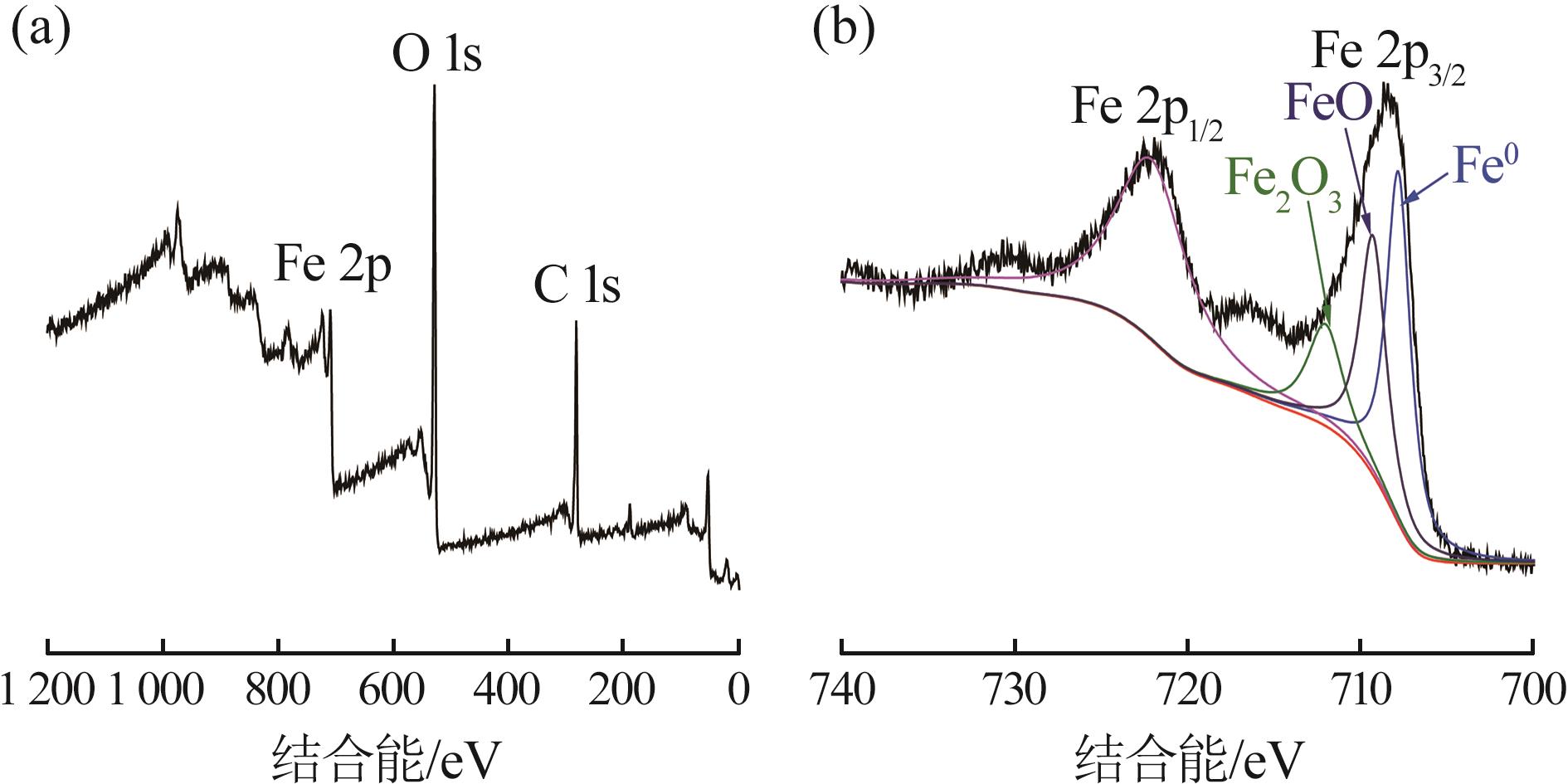 | 图4 nZVI的XPS全扫描图和Fe 2p谱图 (a)XPS全扫描图 (b)Fe 2p谱图 |