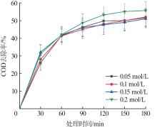 由图4可知,电解质浓度变化对于COD降解率的影响并不明显。与电流密度和pH两个影响因素相比,电解质浓度对于过程的影响相对较小。因此选择0.05 mol/L Na2SO4为最佳添加浓度。