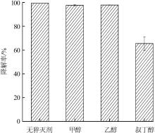 自由基猝灭实验可以确定反应过程中自由基的作用。在改性活性炭催化PS氧化降解MO过程中分别加入甲醇、乙醇和叔丁醇猝灭剂,MO降解率见图6 。