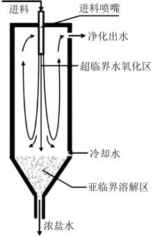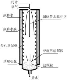 ... Modar公司〔41〕设计出一种逆流式反应器,该反应器可以形成两个不同的温度区,反应器上部保持在超临界水温度以上(如400 ℃以上),是进行超临界水氧化反应的主要区域.反应器下方保持在亚临界水温度区域(如350 ℃左右)〔42〕.污水以一定的进料速度,在反应器上方通过顶部喷嘴进入超临界区域进行氧化反应,生成的无机盐由于重力、惯性和强对流作用进入下部的亚临界区域重新溶解.形成的浓盐水从反应器的底部排出,气体从反应器顶部排出,冷凝后形成脱盐水,如图4所示.但是,由于反应器内表面直接与腐蚀性反应物接触,该反应器无法避免内表面发生盐沉积以及腐蚀的风险. ...