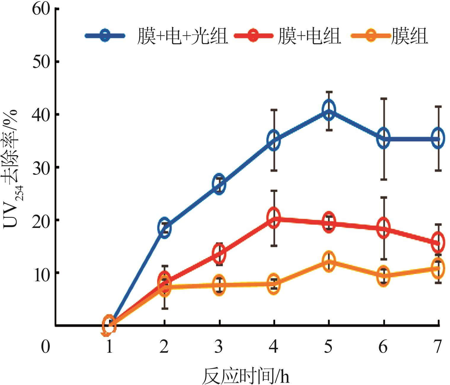 | 图3 3种组合工艺分别处理水样一段时间后UV254的去除效果 |