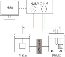 如图1所示,采用阳离子交换膜将阴极室和阳极室分隔,阳离子交换膜材质为Nafion®N117膜,厚度为0.180 mm,交换容量≥0.90 mmol/g,CAS:31175-20-9 d.1.98。阴阳极室的有效工作容积均为100 mL,阴极材料为预处理(在沸水中煮2 h后自然风干)后的碳毡(50 mm×50 mm),阳极材料为石墨板(50 mm×50 mm)。采用与三电极系统相连的CHI1000C恒电位仪(上海辰华仪器公司)控制电极电位,以阴极为工作电极,阳极为对电极,Ag/AgCl电极(上海辰华仪器公司CHI111)为参比电极并置于阴极室中。