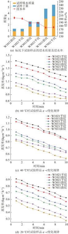 为方便衡量试验材料的失水速干能力,定义蒸发率σ ,即试验材料浸水达到饱和后在单位面积、单位时间内含水量的损失情况,计算方法见式(2)。