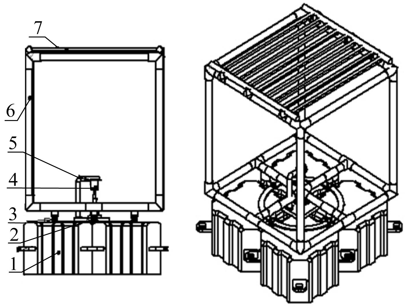 | 图7 蒸发帘强化自然蒸发装置示意 1—浮筒装置;2—旋转电机;3—旋转轮;4—风向仪;5—风向仪架;6—框架;7—喷淋装置。 |