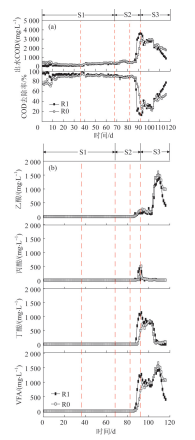 在盐冲击阶段(S2,第69天至第92天),随着NaCl质量浓度的增加,R0和R1的处理性能发生了较大变化。当NaCl质量浓度为10 g/L(第69天—第82天)时,R1和R0的COD去除率略有下降,分别降至(88.5±1.8)%和(87.9±1.8)%。当NaCl质量浓度增加到20 g/L(第83天—第92天)时,COD去除率急剧下降,VFAs开始积累。如图2b所示,VFAs的积累以乙酸和丁酸为主。其中R1的丁酸积累早于R0,且积累程度较高。最终R1的甲烷转化率下降了21.1%,而R0下降了10.6%。随着盐度的上升,GAC-ABR系统的稳定性有所减弱。