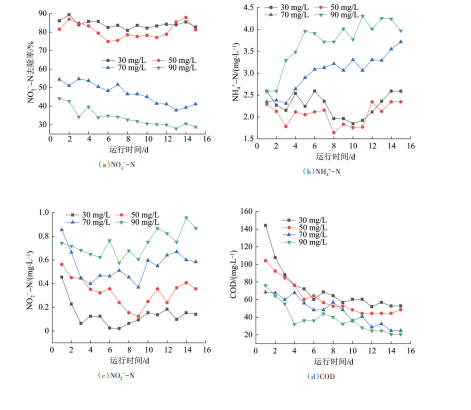 选用4个SBR反应器进行同步实验,控制硝酸钾的量调节进水NO3--N负荷,使其分别维持在30、50、70、90 mg/L,其余条件保持一致,香茅/PS缓释碳源均为120 g,HRT均为12 h,探究合适的进水NO3--N负荷,结果见图3。