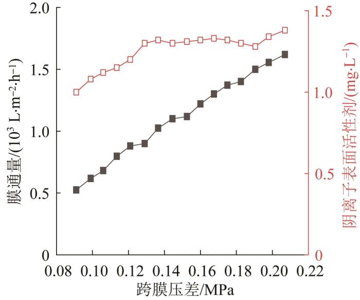 图4 中,总体来看膜通量与跨膜压差呈正相关。试验初始时,随着跨膜压差的增大,产水中阴离子表面活性剂含量逐渐增大;当跨膜压差增至0.13 MPa时,产水中的阴离子表面活性剂趋于稳定(1.3 mg/L左右,回用率达到85.5%);直到跨膜压差增至0.19 MPa时,产水中的阴离子表面活性剂又呈现逐渐上升的趋势。这可能是因为,当跨膜压差<0.13 MPa时,随着跨膜压差的增大,阴离子表面活性剂的通量逐渐增大;0.13~0.19 MPa时,由于碳化硅陶瓷膜对水分子的选择透过性远大于对阴离子表面活性剂,使得水分子通量逐渐增大而阴离子表面活性剂通量变化不明显;当跨膜压差>0.19 MPa时,阴离子表面活性剂逐渐克服膜孔的摩擦与阻碍作用,其跨膜输运的速率大大增加,从而产水中阴离子表面活性剂含量呈逐渐增大趋势。