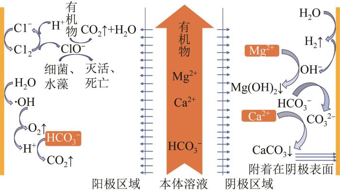 ... 阳极界面区域的主要电化学反应是有水参与的过程,并形成高酸度区域,如式(6)所示.若形成的强氧化性·OH没有及时消耗,则在酸性条件下生成氧气〔12〕〔见式(7)〕.同时,在传质和电场的作用下,HCO3-会迁移到阳极表面区域,随后在高酸度区域发生反应,释放出CO2〔13〕,因此使碱度下降〔见式(8)~式(10)〕;当循环水中存在氯离子时,会形成ClO-,并导致溶液pH降低〔14-15〕.循环冷却水中的有机物、细菌和藻类倾向于与强氧化物质·OH或ClO-反应,其中有机物被氧化成二氧化碳和水,同时藻类和细菌死亡或失活〔16-18〕.值得注意的是,由于缺乏稳定性,·OH只能在阳极表面极性水界面区域与有机物、细菌和藻类发生反应.而稳定性相对较强的ClO-可以离开极性水界面区域并扩散到溶液中,因此经过处理的循环水在离开电化学处理区域时仍具有一定抑制细菌和藻类的能力〔11〕. ...