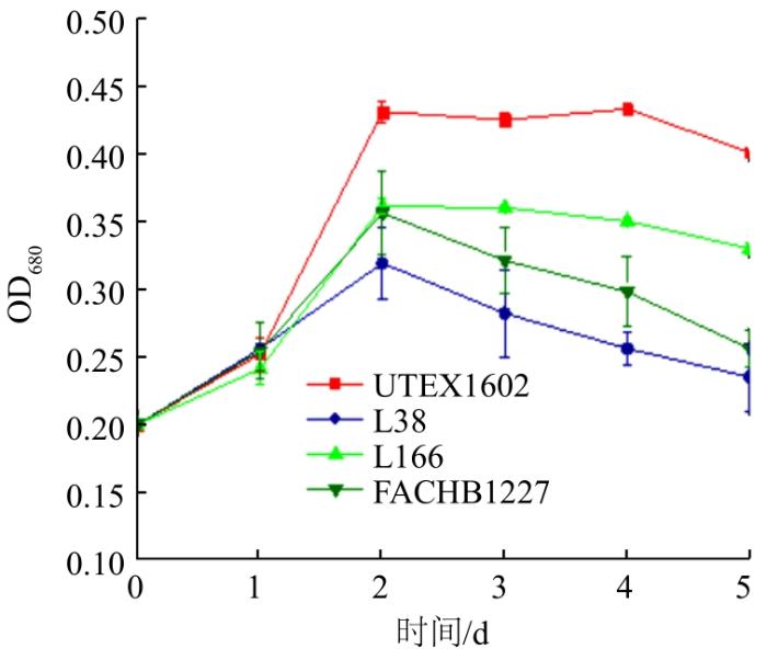 由图2可以看出,在奶牛场乳制品废水中,小球藻的生长速度在0~2 d内呈上升趋势,其中UTEX1602的生长情况较佳,在第2天OD680值达到0.46。在培养的2~5 d,UTEX1602和L166 2个株系生长速度趋于平缓,而L38和FACHB1227株系生长速度持续下降,这可能是因为乳制品废水中有机负荷及营养元素浓度较低,提供给小球藻生长的营养源不足所致。