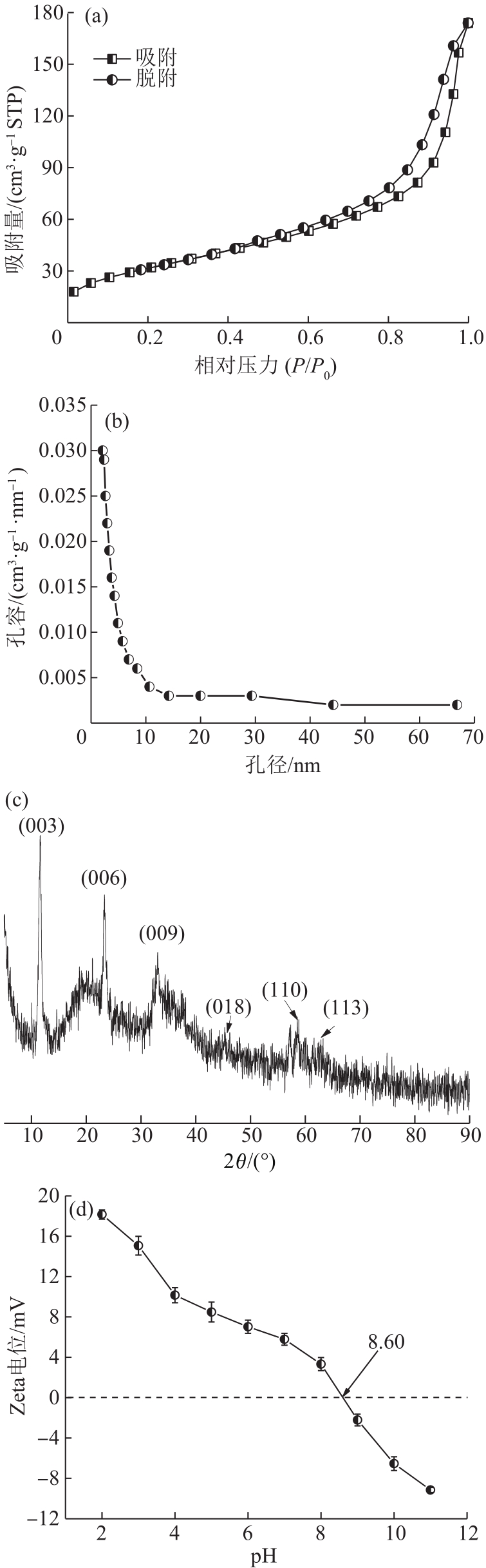 | Fig.2 N2 adsorption?desorption isotherm(a),pore size distribution(b),XRD(c)and zeta potential(d)of FeMn?Cl?LDHs |