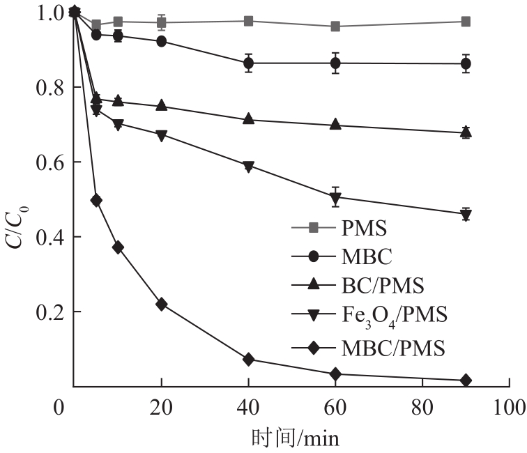 | 图5 不同体系的处理效果 (温度25 ℃,溶液初始pH=7,初始橙黄Ⅱ质量浓度20 mg/L,PMS质量浓度0.4 g/L,MBC投加量0.3 g/L,BC投加量0.3 g/L,Fe3O4投加量0.3 g/L) |