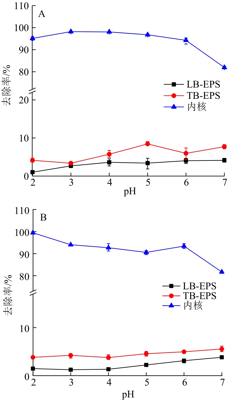 | 图1 颗粒污泥内核微生物及其EPS对Sb(Ⅲ)的去除率(A 以产甲烷菌群为主;B 以非产甲烷菌群为主) |