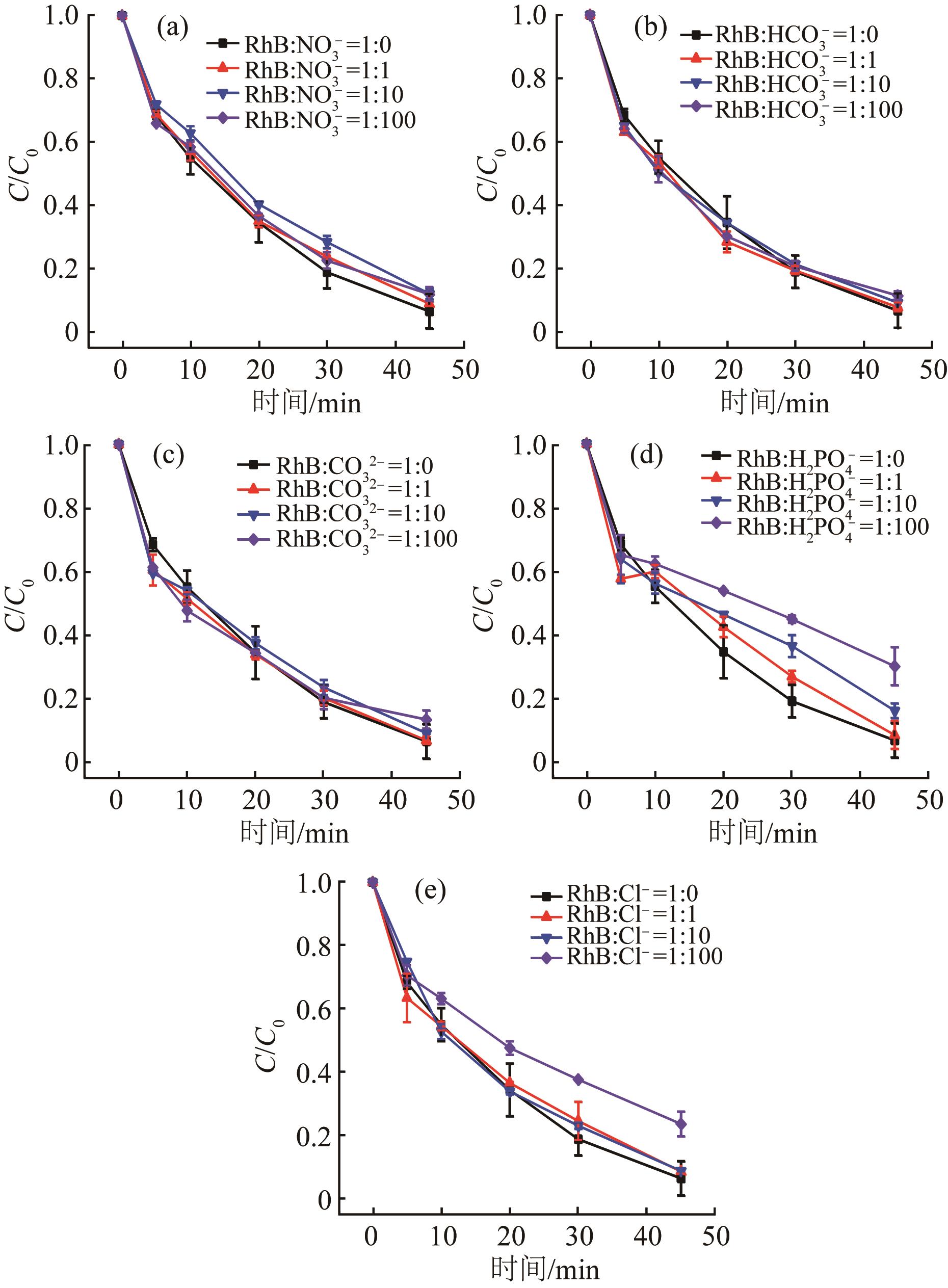 Fig.6 Effects of different concentrations of , , , ,Cl- on the degradation of RhB by UV/Sch/PS system |