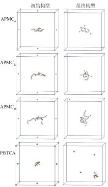 建立边长为8 nm的含有Ca2+的真空盒子模型,该盒子的8个顶角和6个面心处均有Ca2+,盒子内Ca2+总数量为4个。将3种有机化合物分子APMC(R分别为6、12、18)分别放入上述Ca2+真空盒子的中心位置,从而构建完成初始模型。分别对APMC6、APMC12、APMC18与Ca2+的真空盒子的原始模型进行几何优化。使用模块为Materials studio中的Forcite模块,使用力场为COMPASS Ⅱ,动力学系综为NVT,温度为298 K,总时长为50 ps,时间步长为1 fs,总步数为50 000。初始模型、几何优化与分子动力学优化后的最终模型见图8。为验证该方法的合理有效性,对常规缓蚀阻垢剂2-膦基丁烷-1,2,4-三羧酸(PBTCA)也进行了同参数条件下的模拟计算,并将PBTCA的计算结果与APMC进行比较。