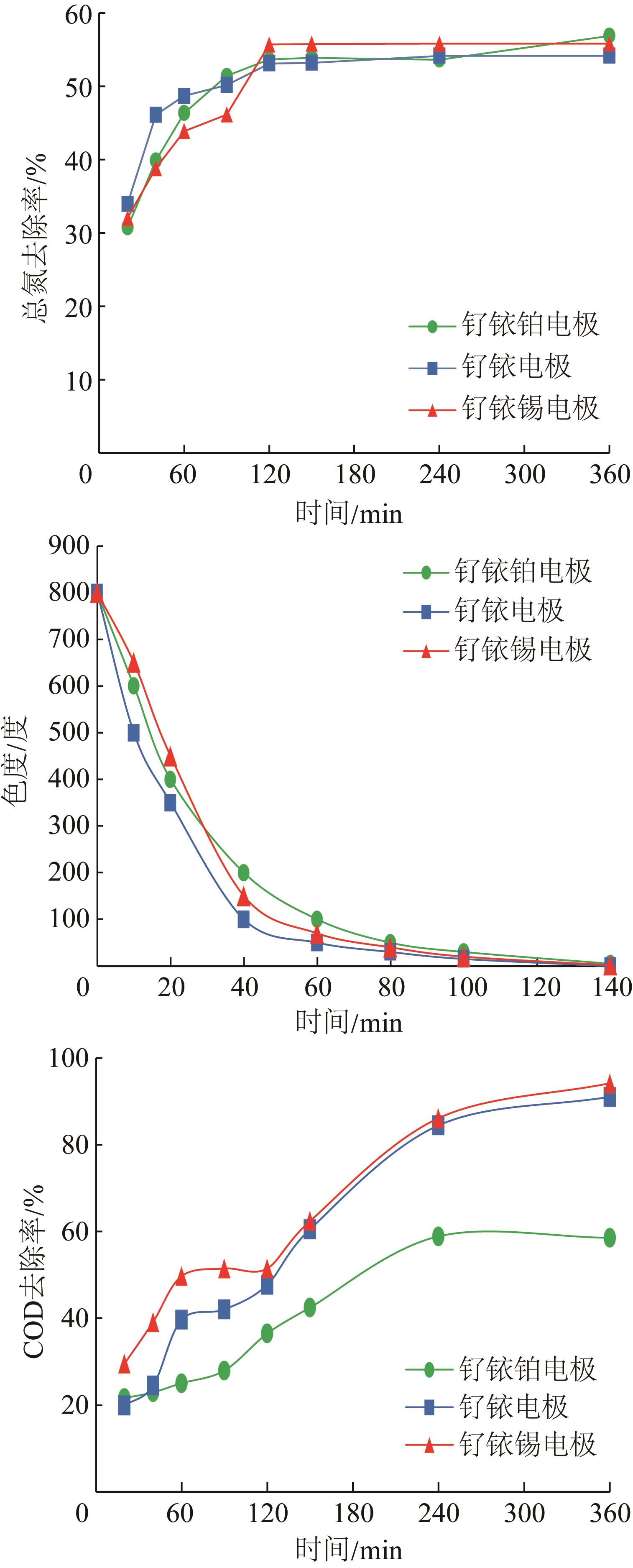 | 图2 不同阳极对总氮、色度和COD去除率的变化曲线 |