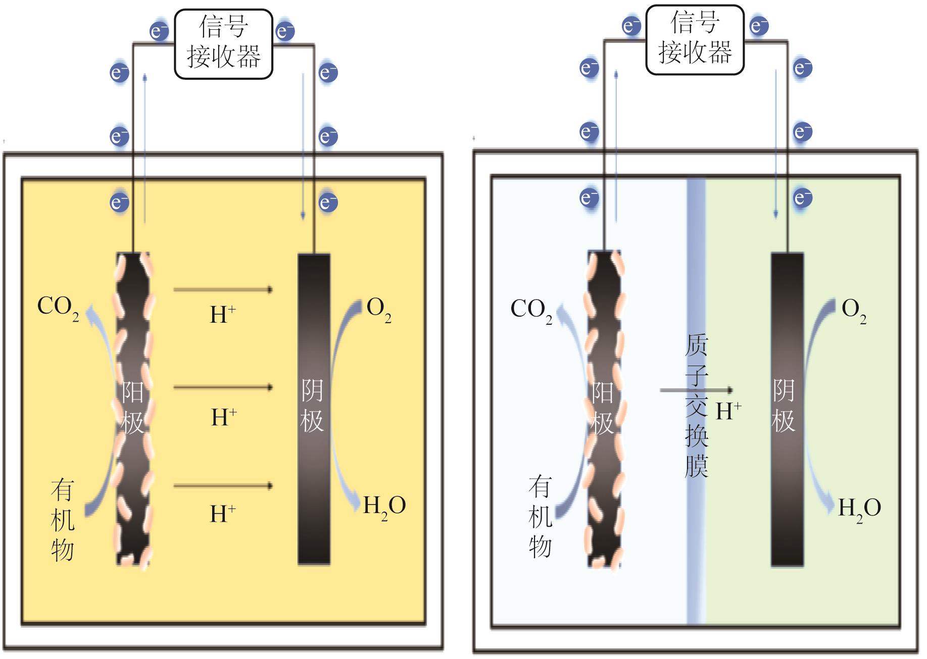 | 图2 MFC型BOD传感器原理示意 (a)单室MFC型BOD传感器 (b)双室MFC型BOD传感器 |