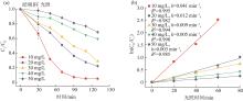 紫外光照射下,在pH=7条件下向80 mL MB溶液中投加0.15 g催化剂,考察PVA/SrTiO3/TiO2/Ag在不同MB初始质量浓度下的催化性能,并研究其相应的光催化动力学,结果见图6。