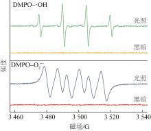 在光催化过程中,光催化剂表面活性位点产生的活性物质与染料分子接触而反应。对PVA/SrTiO3/TiO2/Ag复合材料进行EPR测试,以5,5-二甲基-1-吡咯啉-N-氧化物(DMPO)为清除剂,加入水检测·OH,加入二甲基亚砜(DMSO)检测O2·-,结果见图9。