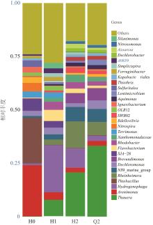 由图7可见,H0中Arenimonas(砂单胞菌属)作为需氧细菌菌属,可以降解各种糖和氨基酸〔24〕,有个别菌株含有反硝化作用的关键酶〔25〕,Thiobacillus(硫杆菌属)能够进行自养反硝化作用〔26〕,这2种优势菌属在初期可以保证整个活性污泥系统的脱氮能力及降解污染物的能力。当TDS提升至4 000 mg/L时,2种菌属的生长受到抑制,Hydrogenophaga(噬氢菌属)占据绝对优势,相对丰度最高达到15.6%,在此驯化阶段出水TN持续降低,可能是由于Hydrogenophaga参与了同步硝化-反硝化过程〔27〕。当TDS为7 000 mg/L时,原优势菌属逐渐被Thauera(陶氏菌属)和Rheinheimera(莱茵海默氏菌属)取代,Thauera物种丰度由0.12%快速增加至12.08%,Rheinheimera物种丰度由1.28%增加至7.23%。Thauera可降解的污染物广泛,有利于污水中污染物的去除〔28〕,且有研究发现Thauera与Rheinheimera在高盐环境下仍可保持良好的脱氮及降低COD的能力〔29-30〕。缺氧池作为整个工艺的核心脱氮反应段,其对应样品Q2中的Thauera相对丰度占比最高(21.03%),这也是污泥驯化末期装置出水达标的主要原因。具有脱氯能力的次优势菌属Dechloromonas(脱氯菌属)在氯离子不断提高的情况下,相对丰度由1.03%增加至2.54%,促进了系统的硝化能力,NS9_marine_group菌属因其较高的抗逆性〔31〕,相对丰度由0.73%增至3.97%。次优势菌属的演替再次验证了最后阶段的良好出水水质状态;在整个耐盐活性污泥驯化及高盐废水处理过程中,系统功能菌种类丰度增加,处理能力得以增强。