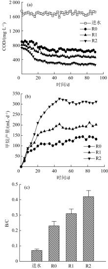 厌氧反应器出水的COD(a)、产甲烷量(b)、B/C(c)变化情况