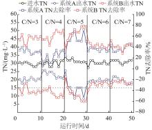 (3)不同C/N进水对COD降解效果的影响较小,控制C/N在3~7之间,平均出水COD均在50 mg/L以下。且两系统出水TN变化趋势均与NH4+-N变化趋势类似,可见NH4+-N去除效果是出水TN变化的主要影响因素。
