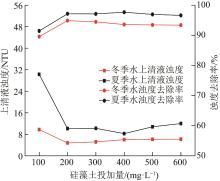 由图3可知,随着硅藻土投加量的增加,水体浊度去除率呈现先快速升高再平稳略有下降的趋势。硅藻土投加量为200 mg/L时,冬季水上清液浊度可达最低值4.78 NTU,浊度去除率为94.89%。投加量为400 mg/L时,夏季水上清液浊度为8.25 NTU,浊度去除率取得最高值,高达97.67%,冬季水上清液浊度为6.01 NTU,浊度去除率为93.58%。200 mg/L PAC+硅藻土联合投加的脱浊效果优于PAC单独投加,说明混凝剂PAC联合成核剂硅藻土可以强化混凝效果,提高浊度去除率。硅藻土具有大比表面积、高表面能以及很强的吸附性能,极易吸附聚集脱稳胶体。除此之外硅藻土还可以充当絮凝的骨架材料,可有效提高絮体的密度,侧重改良絮体沉降性能〔18〕。硅藻土投加量超过400 mg/L时水体浊度呈现升高趋势,观察到水体中悬浮物变多,说明过量投加硅藻土反而不利于混凝沉淀。这有可能是因为过量的硅藻土离解后表面大量负电荷与矿井水中同样带负电荷的胶体颗粒同性相斥而影响絮凝体致密化,导致浊度升高。