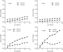 实验分别考察了不同PAC投加量对超滤膜和反渗透膜过滤性能的影响,PAC投加量分别为2.0、5.0、10.0、15.0 mg/L,实验时超滤膜系统采用恒流量运行,实验结果见图1。