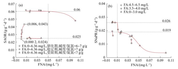 对于AOB,第Ⅰ阶段系统处于启动适应状态,菌群活性低;第Ⅱ阶段系统处于驯化增长状态,菌群活性逐步上升;第Ⅲ阶段系统处于稳定运行状态,菌群活性达到最大;第Ⅳ阶段系统受限于碱度不足的影响,菌群活性下降。从图4 (a)可以看出,FNA质量浓度在0~0.005 mg/L、碱度/氨氮在6~7 g/g的驯化期,当FA质量浓度从1.12 mg/L增至6.36 mg/L时,SAOR从0.027 g/(g·d)上升至0.033 mg/L;FNA质量浓度在0.01~0.05 mg/L、碱度/氨氮>7 g/g的稳定期,当FA质量浓度从1.68 mg/L增至3.85 mg/L时,SAOR稳定在0.06 g/(g·d)左右;FNA质量浓度在0.01~0.05 mg/L、碱度/氨氮<6 g/g的受限期,在FA质量浓度从0.15 mg/L增至2.15 mg/L时,SAOR稳定在0.025 g/(g·d)左右。在0~6.5 mg/L范围内,各进水阶段FA浓度对AOB活性无显著影响,但碱度不足对AOB活性有明显抑制作用。