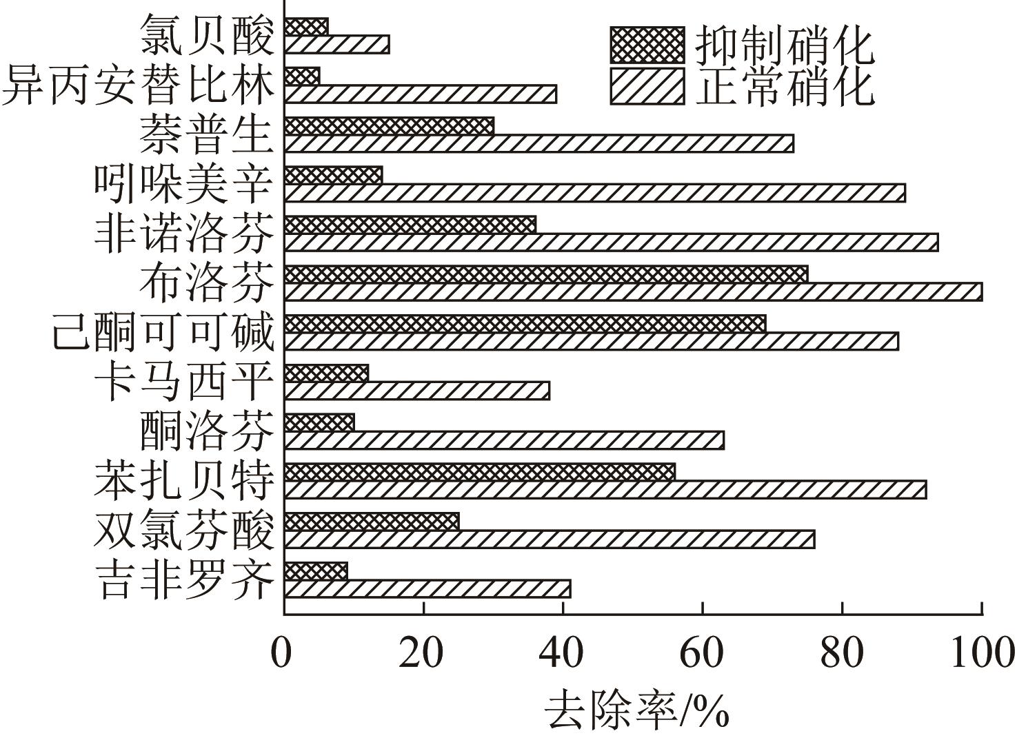 | Fig. 2 Removal rate of different pharmaceuticals by nitrifying sludge with and without ATU |