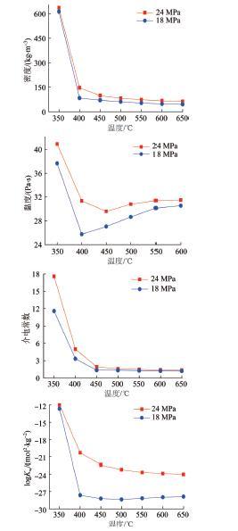 分析原因,一方面是因为超临界水氧化状态和过热近临界水氧化状态所处状态不同。与常温常压状态相比,超临界/过热近临界水氧化状态下水的主要物性参数发生了变化。图5展示了2种状态下水的物性参数随温度的变化。