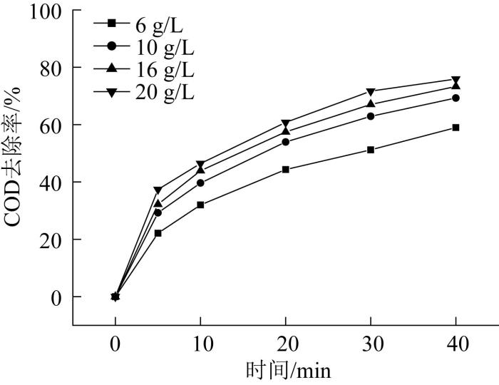 由图5可知,随着催化剂投加量的增加,体系对废水COD的去除率逐渐提升,这说明催化臭氧氧化反应效率随着固相表面催化活性位的增多而提高。当催化剂投加质量浓度为20 g/L,在反应时间40 min时废水COD的去除率达到75.92%。此外,从图5还可以看出,当催化剂投加质量浓度由6 g/L增大至10 g/L时,废水COD的去除率提高了10.31%,继续提升催化剂投加质量浓度至20 g/L,COD去除率仅提高了6.65%,增幅明显减小。说明当催化剂投加量达到一定程度时,其就不再是催化臭氧氧化反应效率的限制因素,因此在工程应用中可以根据处理成本选择适宜的催化剂投加量。本研究中综合考虑反应经济性,后续实验采用的催化剂投加质量浓度为10 g/L。