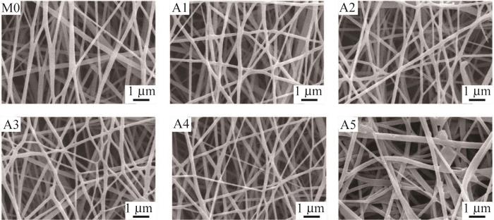 将上述制备的纺丝液加入到10 mL的注射器内,将注射器固定在微量注射泵上,注射泵的针头与高压电源的正极相连,负极连接接收滚筒。控制电纺电压为10 kV,接受滚筒到针头的距离为15 cm,纺丝液流速为1.0 mL/h进行电纺膜的制备。电纺完成后将制备出的Ag/TiO2/PVDF电纺膜放入盛有去离子水的烧杯中,40 ℃水浴加热3 h后取出,得到一系列纳米纤维膜,膜中Ag/TiO2与PVDF质量比分别为1∶100、2∶100、3∶100、4∶100、5∶100,编号从A1到A5。按照上述方法在不添加Ag/TiO2条件下制备纯PVDF膜,记作M0。
