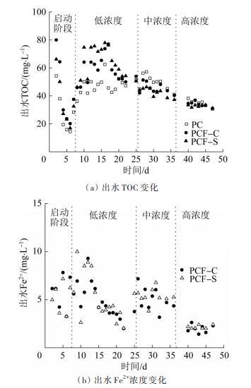 ... 由图2(a) 可知,实验期内3种基质条件下出水TOC均呈现先升高再逐渐下降的趋势,初期碳源溶出量大,释碳迅速,此时碳源的释放机制为骨架溶蚀和扩散作用,之后碳源释放量逐渐衰减〔9 〕 ,经过长达48 d的释碳,最终出水中TOC稳定在35 mg/L左右.由图2(b) 可知,2种PCF基质条件下,实验前期铁释放量较大,随着时间推移铁释放量逐渐下降,最终在高浓度进水阶段出水中Fe2+ 稳定在2.1 mg/L左右.以上说明2种PCF基质均具有较好的有机碳源和Fe2+ 长期释放性能. ...