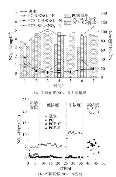 由图4 可知,在进水初期,PCF碳源滤池启动迅速,PCF-C、PCF-S碳源滤池在第2天即分别实现对NO₃⁻-N 91.73%、87.03%的去除率,而PC碳源滤池启动期出水NO₃⁻-N波动较大,用时7 d实现对NO₃⁻-N的稳定去除,可见PCF基质可实现反应器的快速启动,原因在于:(1)PCF碳源基质前期碳源溶出量较高,有利于脱氮微生物的大量生长繁殖;(2)PCF基质中玉米芯和聚己内酯溶蚀产生的有机碳源和Fe2+ 有利于反硝化滤池中共基质模式的形成,研究表明基于铁盐的自养反硝化菌多为混合营养型细菌,添加有机物可提高铁盐脱氮微生物的活性〔13 〕 ,PCF基质即是在铁自养脱氮微生物和异养脱氮微生物的共同作用下完成了滤池的快速启动。