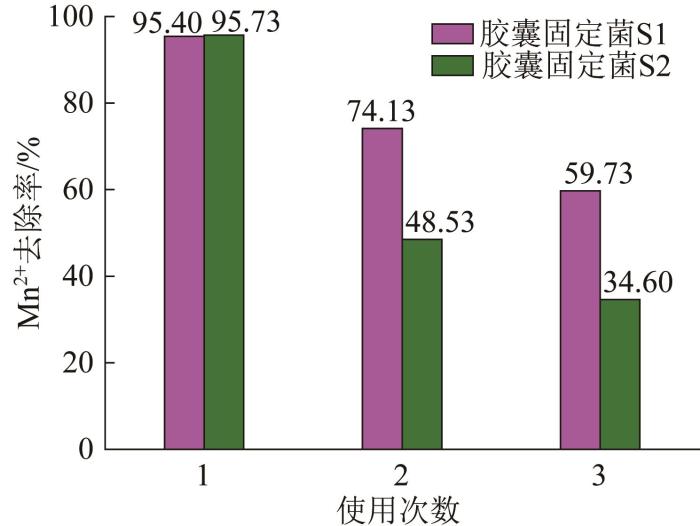 (3)在最佳除锰条件下,胶囊固定菌S1、S2第1次使用时的除锰率分别为95.40%、95.73%,经3轮重复实验后胶囊固定菌的除锰率仍有59.73%、34.60%,说明胶囊固定菌具有一定重复利用性。