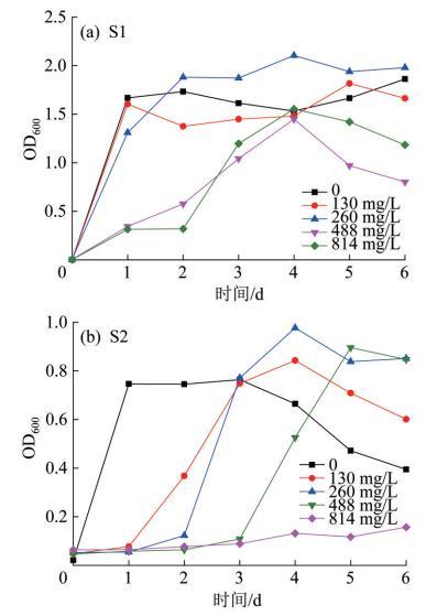 由图4可知,菌株S1、S2在6 d的培养过程中,菌液pH都呈逐步升高的状态,由最初的6.5上升到9.0以上。