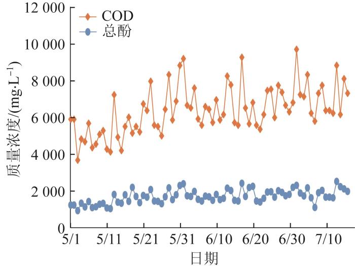 由图3可看出,酚氨回收单元出水COD在3 670~9 680 mg/L,平均值6 377 mg/L,超过设计值,且出水COD呈现逐渐增加的趋势。出水总酚为923~2 507 mg/L,平均1 693 mg/L,远超设计值,且同样呈现逐渐增加的趋势。
