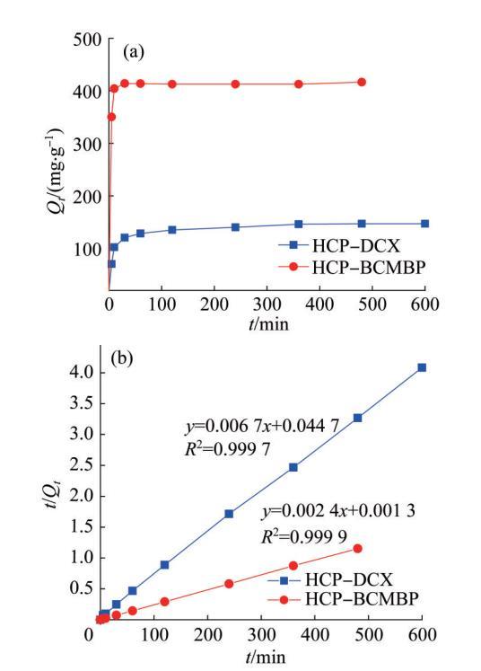 在温度为303 K,CTC的初始质量浓度为500 mg/L,pH=5,吸附剂的投加质量浓度为1.0 g/L条件下,对HCP-DCX、HCP-BCMBP吸附CTC的动力学进行研究,并采用准二级动力学模型对数据进行拟合,结果见图2。