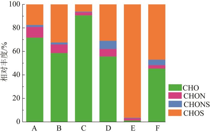 利用FT-ICR MS分析了两类页岩气产出水DOM样品的组成。按照分子组成划分,FT-ICR MS检测结果将产出水DOM中的有机物分为CHO、CHON、CHOS、CHONS四类,各气井中不同种有机物的相对含量如图3 所示。