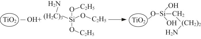 (2)以P25 TiO2为原料,采用水热合成法处理〔1〕,随后加入装有甲苯的烧瓶中超声分散,依次加入KH-550和三乙胺,在62 ℃恒温条件下搅拌反应6 h,依次用甲醇、超纯水和丙酮洗涤、过滤,最后在80 ℃下真空干燥12 h,备用。