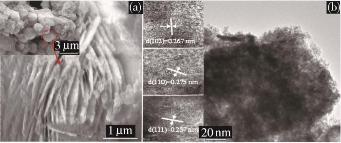 由图2(a)可知,Ti-BiOCl纳米片呈玫瑰花瓣状分布,厚度约为25~250 nm;由图2(b)可知,晶格间距为0.267、0.275、0.257 nm分别对应BiOCl(JCPDS:No.85-0861)的(102)、(110)、(111)晶面,说明Ti-BiOCl纳米片晶面发育良好,具有良好的晶体结构。