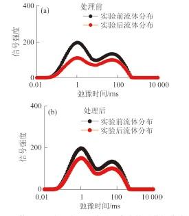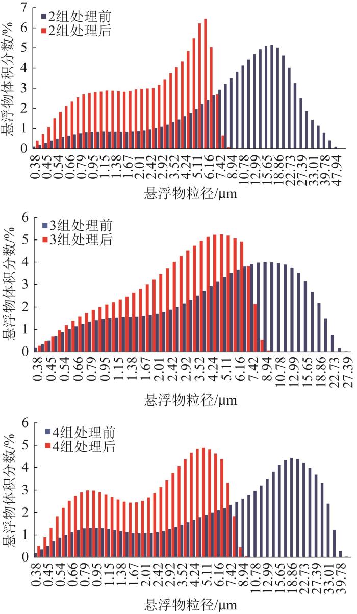 ... (1)通过激光衍射粒度分析仪对不同工艺(“沉降除油”、“沉降除油+二级过滤”、“破乳+油水分离+沉降除油+气浮+旋流分离+过滤”)处理前后的采出水进行测试,得到粒径-数量占比分布、粒径-表面积占比分布和粒径-累计占比分布等相关数据;(2)根据《气田水回注方法》(SY/T 6596—2004)中的规定,测量悬浮物浓度以及含油量〔25〕;(3)将岩心进行清洗后烘干,进行分组编号;(4)配制模拟地层水样;(5)平流泵以0.05 mL/min的恒定流量注入10倍孔隙体积的模拟地层水确保饱和充分,并液测岩心原始渗透率;(6)以0.05 mL/min的恒定流量注入10倍孔隙体积的采出水,并静置24 h,使得采出水与岩心充分反应;(7)计算步骤(4)反应后的岩心伤害后孔隙度并液测伤害后渗透率;(8)通过原始岩心孔隙度、渗透率与岩心伤害后的孔隙度、渗透率进行对比,从而计算孔隙度、渗透率下降率;(9)应用核磁共振技术对造成孔隙度、渗透率下降率最大的实验组进行核磁共振T2谱测试;(10)将实验前后测得的核磁共振T2谱绘制在同一张图上,确定实验前后岩心样品核磁共振T2值范围,计算实验前后岩心样品核磁共振T2谱叠合区域面积;(11)根据叠合区域面积的计算结果分析造成堵塞的伤害程度. ...