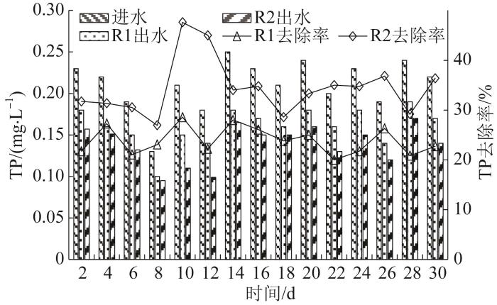 吸附和聚磷菌等微生物的作用是自然挂膜碳纤维生态草去除TP的主要途径,光合细菌通过氧化磷酸化和光磷酸化作用可降低河水中的TP,TP的净化效果如图9所示。