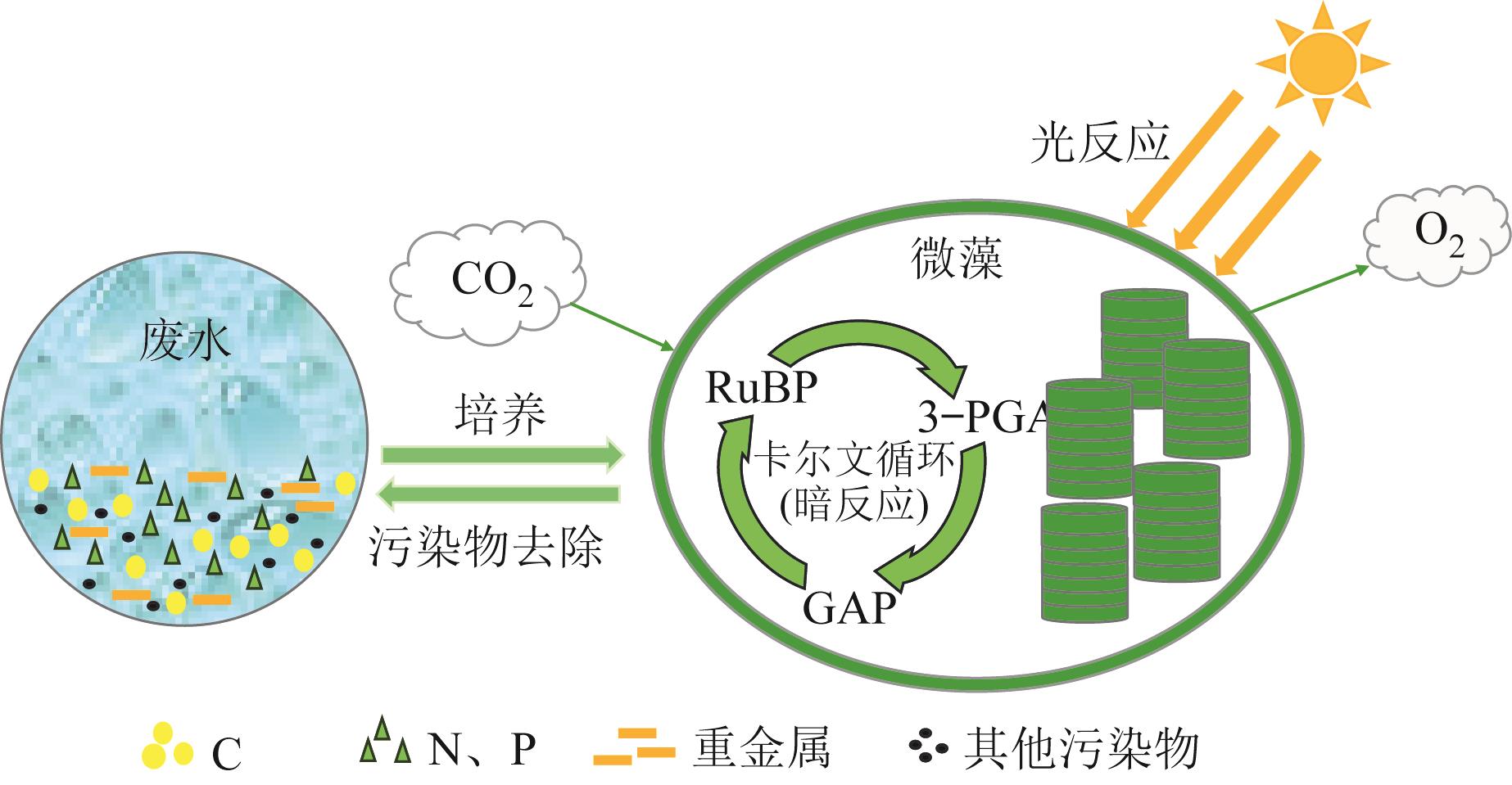 | Fig.1 Schematic of pollution reduction and carbon reduction mechanism of single microalgae technology |